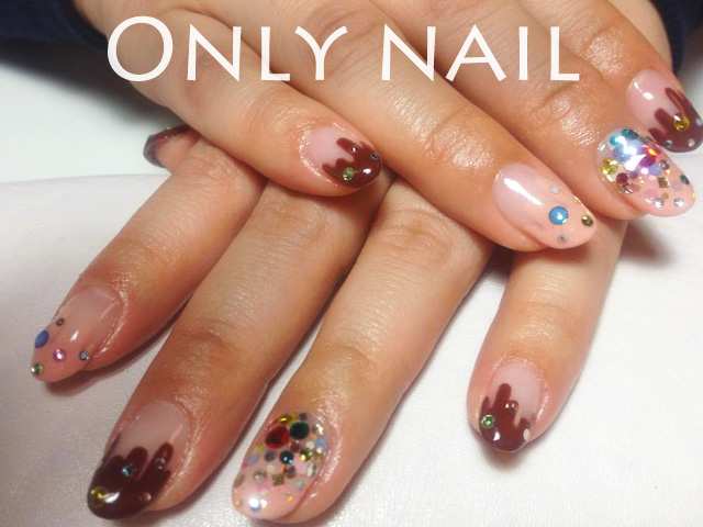 福岡市内の自宅サロンでハンドジェルネイル バレンタインですから! タラリ…のネイルはチョコレートをイメージするのに、1番マッチします☻ トッピングするみたいに、ストーンを散りばめてみました☆ もちろん、全部スワロですよ^_^